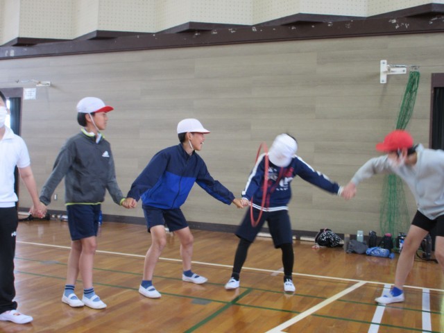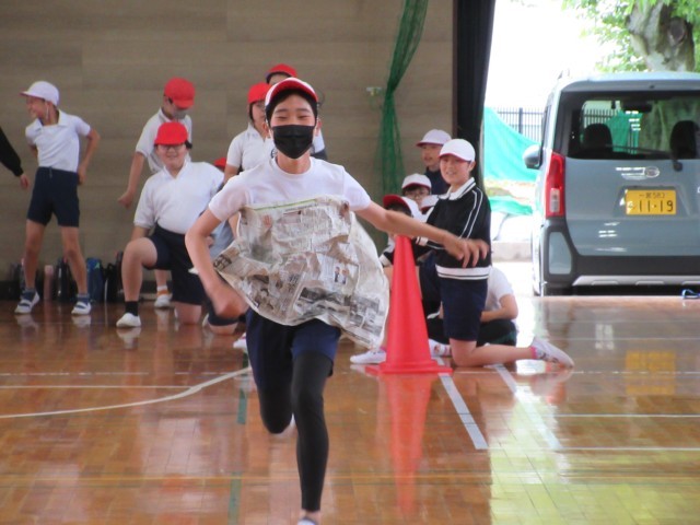 集団行動をそろえた後は、学級対抗で新聞運びリレーやフラフープ通しをして盛り上がりました。楽しむときは楽しみ、やるときはきちんとやる。メリハリを心がけて1時間学ぶことができました。