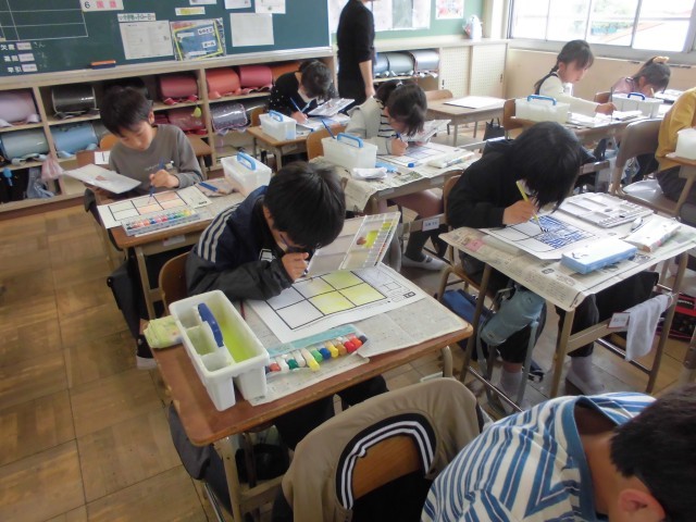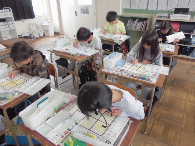 初めての図工の授業でした。絵の具を使って、さまざまな線を引きました。集中して取り組んでいました。