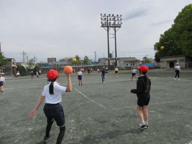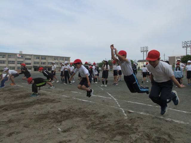 毎年行われる体力テストに向けて、50m走のスタートダッシュ、立ち幅跳び、ボール投げの練習をしました。立ち幅跳びでは、体全体をばねのように、縮ませて大きく伸びながらジャンプしました。ボール投げは、斜め上をめがけて大きく腕を振って、より遠くにとばせるようにコツをつかみました。