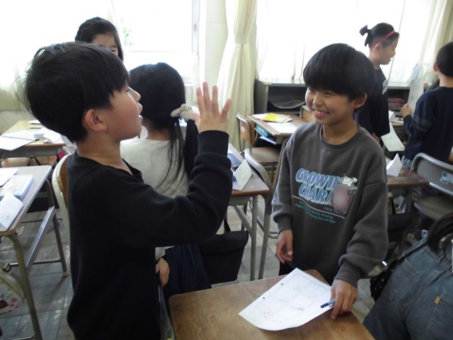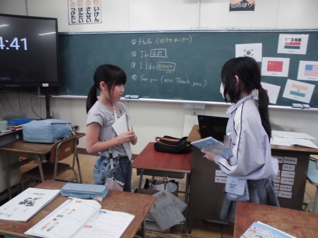 外国語の授業で、様々な国の言語で挨拶をし、英語で自己紹介をしました。クラスの子に英語で上手に好きなものを伝えることができました。