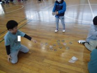 屋内運動場で、むかしのあそびをしました。けん玉やめんこ、ヨーヨーにお手玉、だるま...