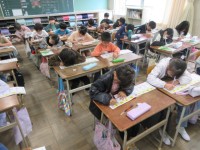 今日は、国語の学習で、帽子に貼った言葉を相手が言えるような質問を考えて、うまく引き出そうと話し合いをしました。いろいろな視点から考え、質問をしている子どもたちの様子が見られました。また、活発な話し合い...