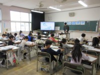 1年生の学活、2年生の生活、3年生の理科の授業の様子です。1年生の学活では、タブレット端末を使って、アンケートに回答しました。2年生の生活では、「まちたんけん」に向けて、萩原商店街などで知っているお店を思い出しました。3年生の理科では、こん虫の観察について、知っていることなどを確かめました。