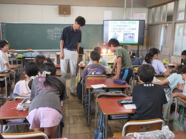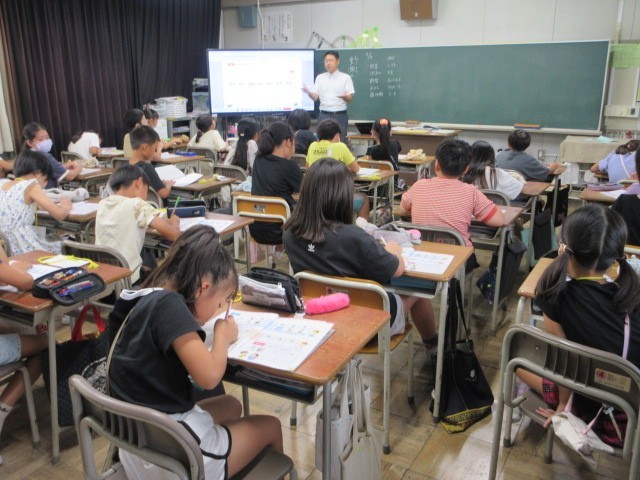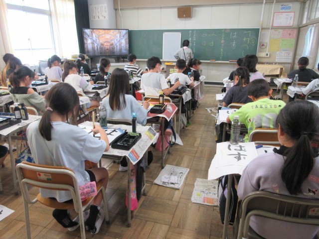 書写、英語活動、学活の授業です。3枚目の学活の「緑のカーテン」講座では、緑のカーテンがどのような効果があるか、電球を利用した実験で確かめました。