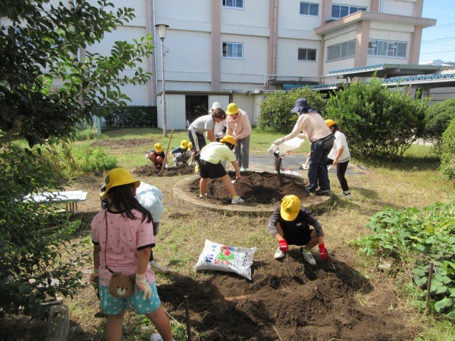ふれあい学級では野菜を育てるために、みんなで力を合わせて畑を耕しました。
