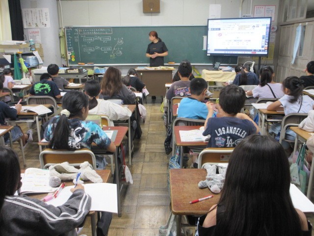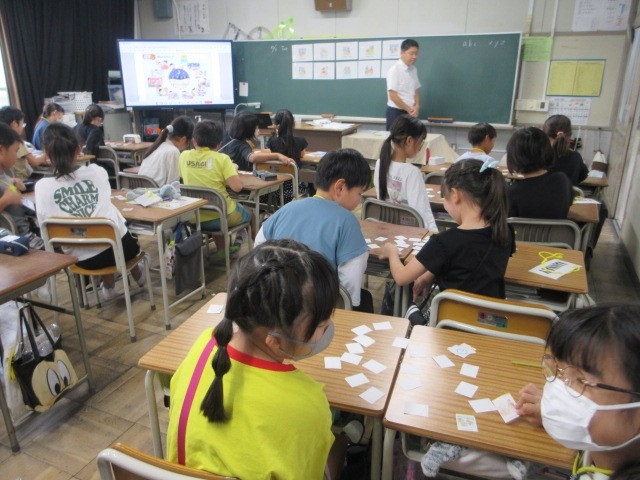理科、英語活動、算数の授業です。1枚目の理科の「ヒトの体のつくりと運動」では、人体の骨格模型を参考にして確かめました。