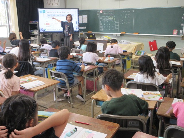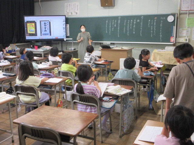 国語、算数の授業です。2枚目の国語の「みの回りのものを読もう」では、一目でわかるように工夫されていることを考えました。