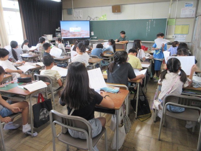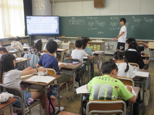 算数、国語の授業です。1,3枚目の算数では、問題を読み、何倍かしたときの大きさを求めて比べてみました。