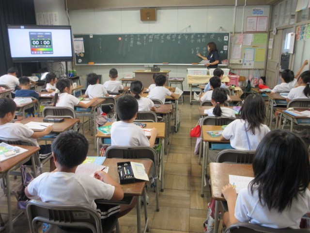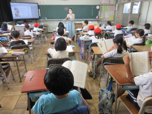 国語、体育の授業です。2枚目の国語の「かん字の読み方」では、同じ漢字でも、違う読み方があることを確かめました。