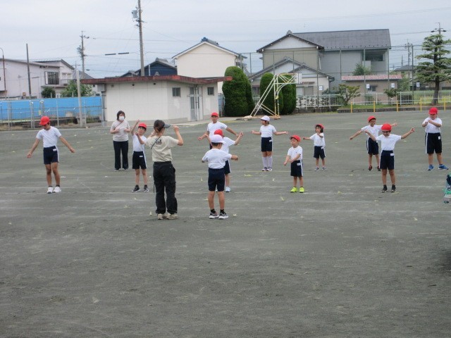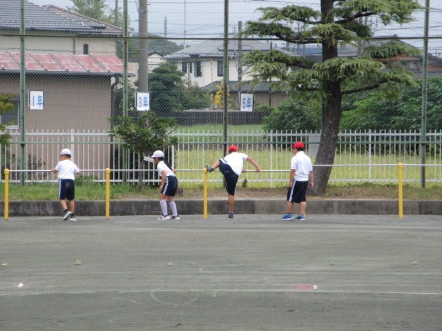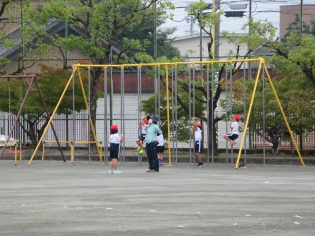 体育の授業です。登り棒や鉄棒を使った運動に挑戦しました。