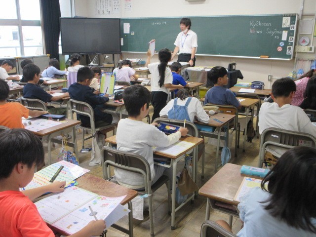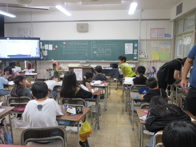 算数、国語の授業です。1枚目の算数では、コンパスを使って長さくらべに挑戦しました。