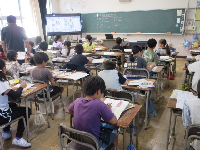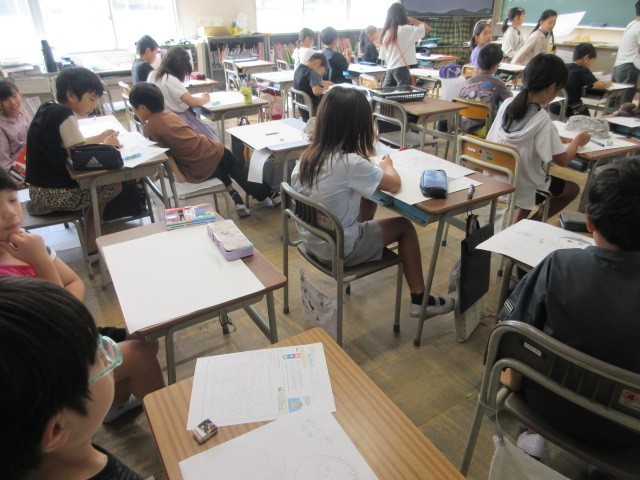 社会、図工の授業です。1,2枚目の社会では、スパーマーケットのしくみや工夫など、学習したことを新聞形式でまとめました。