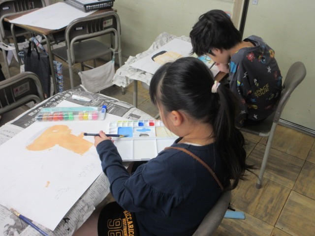 体育、図工の授業です。2枚目の図工では、お話を聞いて、描きたい場面を絵の具で着色していきます。