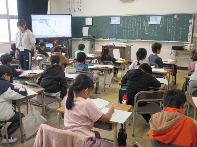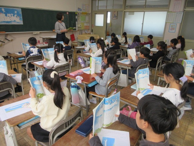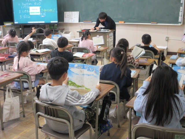 国語の「くじらぐも」の授業です。「くじらぐも」に乗って空を旅する子どもたちの気持ちを想像しながら音読に挑戦しました。