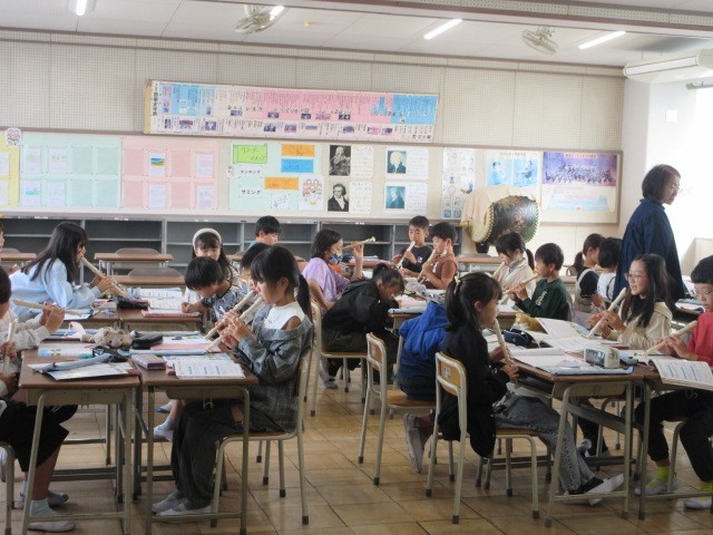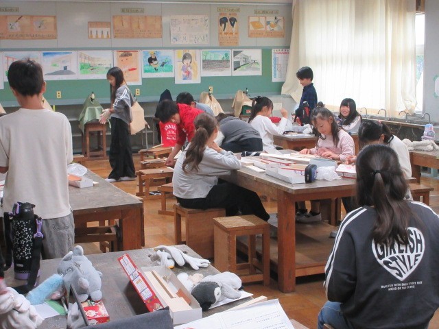 図工、音楽、学活の授業です。1枚目の図工では、のこぎりを安全に使用して木を切ったり、紙やすりで磨いたりして作品作りに挑戦しました。