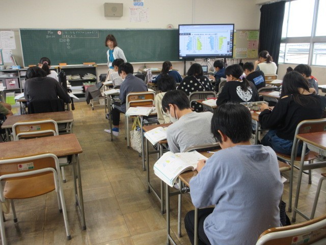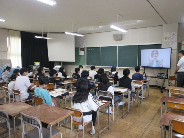 算数、英語の授業です。2枚目の英語の授業では、映像資料に出てくる自分のペンや自動車などがどこから来たものかを、英語で表現することに挑戦しました。