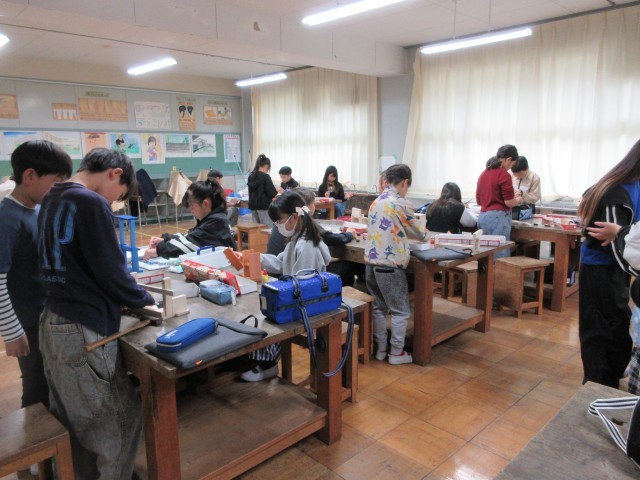 4年生の図工では、のこぎりで切った木材を金づちと釘で組み立て、立体作品を作りました。