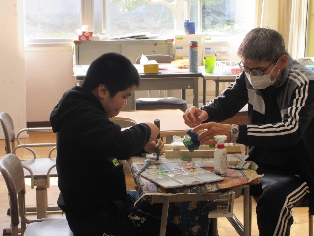 ふれあいの授業の様子です。2枚目の図工では、木片にかなづちでくぎを打つことに挑戦しました。