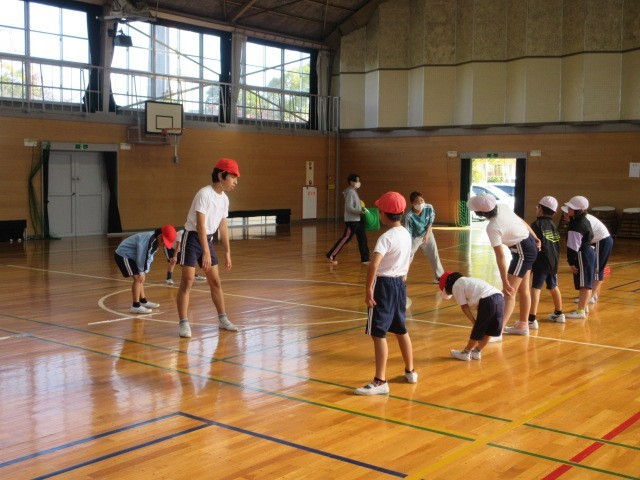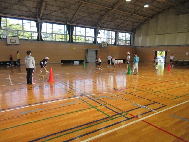 体育の授業です。みんながボールに触れるようにドッジボールに挑戦しました。