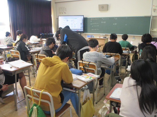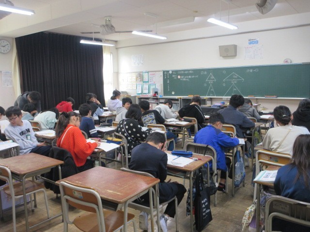 家庭、算数の授業です。3枚目の算数の「図形の拡大・縮小」では、方眼のマス目の数に目をつけて形を調べました。