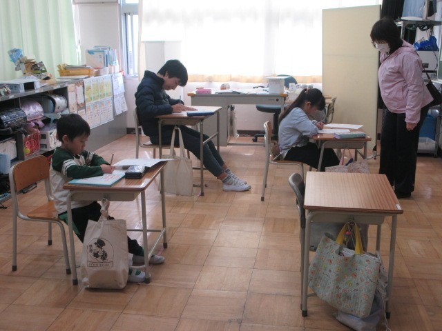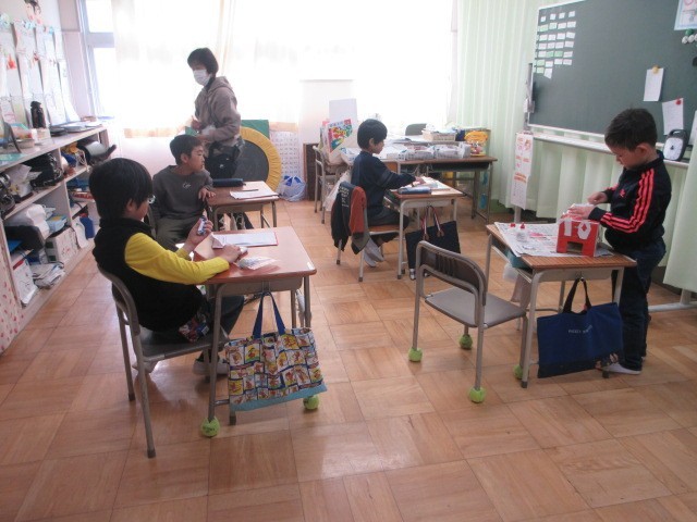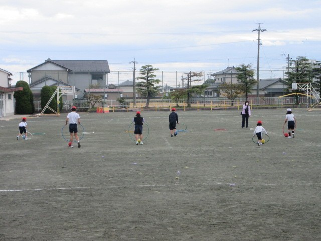 ふれあいの授業の様子です。1枚目の体育では、フラフープを使って、ボールを目標まで運ぶことに挑戦しました。