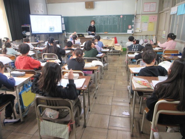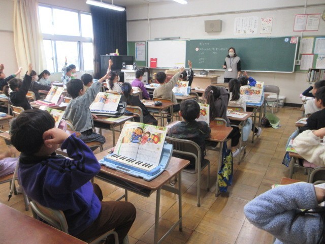 音楽、体育、国語の授業です。1枚目の音楽の「村まつり」では、お祭りをイメージさせるものを予想し、お祭りの気分でいきいきと歌いました。