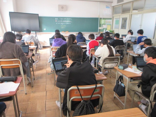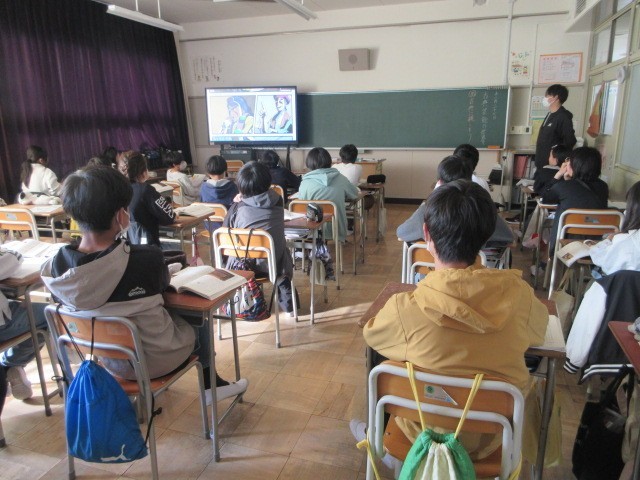 総合、国語、体育の授業です。2枚目の国語の「古典芸能の世界」では、映像資料も参考にして「狂言」について調べました。