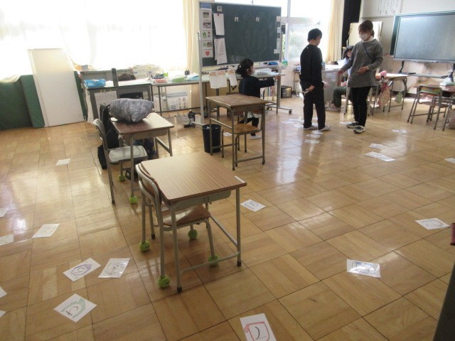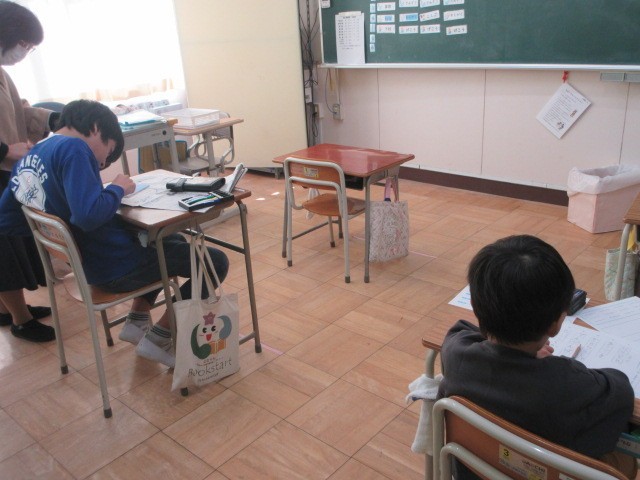 ふれあいの授業の様子です。図工の作品づくりや国語のプリントに取り組んでいます。