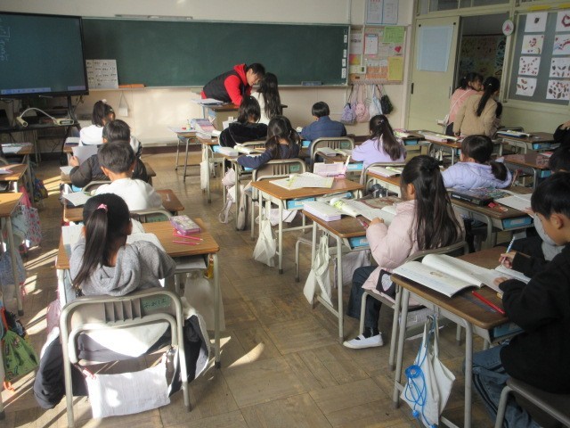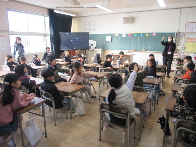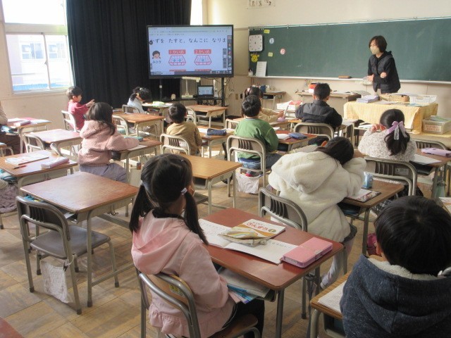 学活、国語、算数の授業です。1枚目の学活では、ALTの先生と四角や丸などの形について、英語表現を楽しみました。