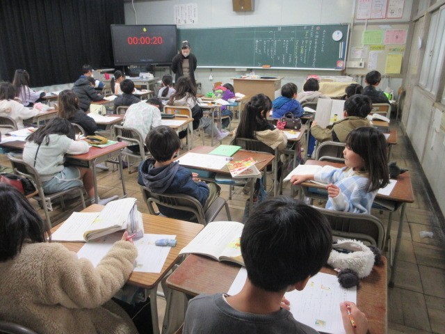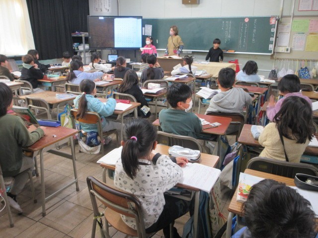 算数、国語の授業です。3枚目の国語の「せかい一の話」では、挿絵を見ながら話を聞き、おもしろいと思ったことを発表しました。