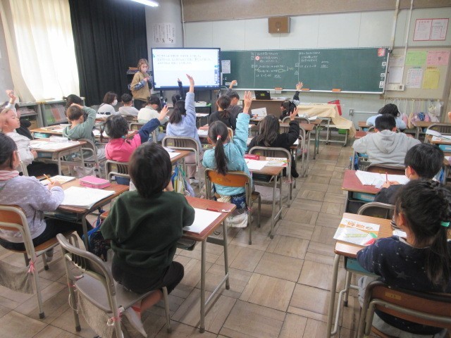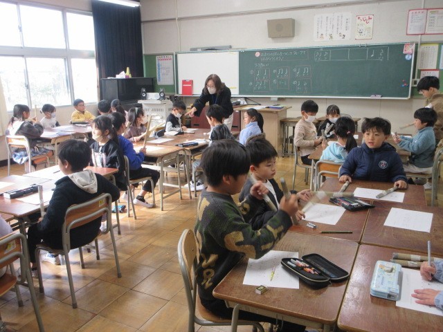 音楽、体育、算数の授業です。1枚目の音楽では、お祭りのリズムをつくってグループで発表しました。