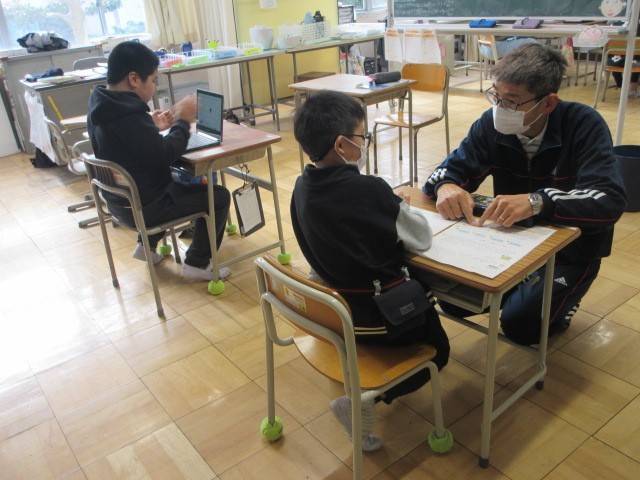 ふれあいの授業の様子です。カタカナのカードで読み方や単語を確かめたり、算数のプリントに取り組んだりしました。