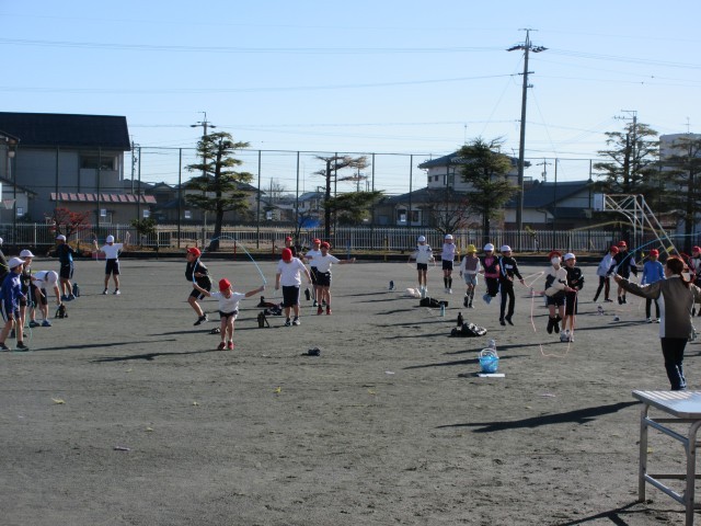 4年生の体育では、縄跳びでさまざまな跳び方に挑戦していました。休み時間にも、多くの児童が縄跳びの練習に励んでいます。
