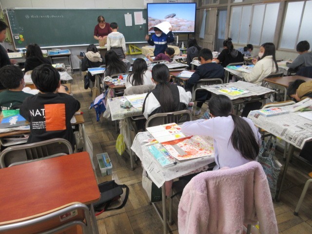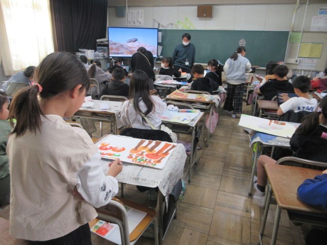 体育、図工の授業です。2,3枚目の図工では、完成をめざして、色塗りに取り組みました。