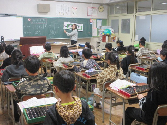 音楽、国語、書写の授業です。1枚目の音楽では、木琴の音で汽車の走る様子を表現しました。