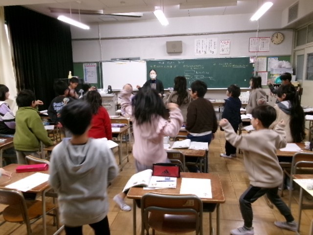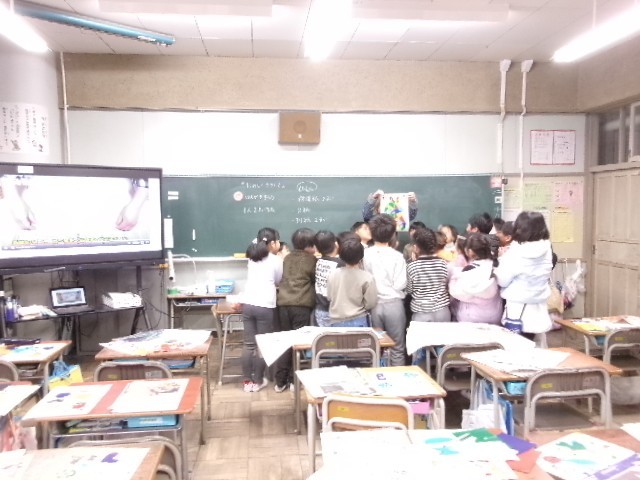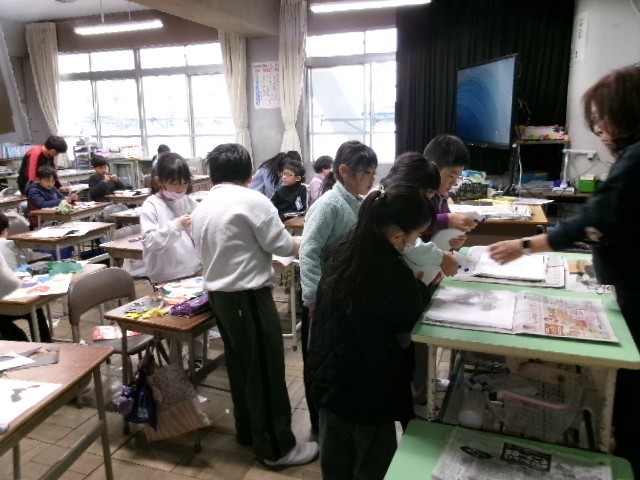 図工、音楽の授業です。1、3枚目の図工では、紙を霧吹きで湿らせて刷りに挑戦しました。