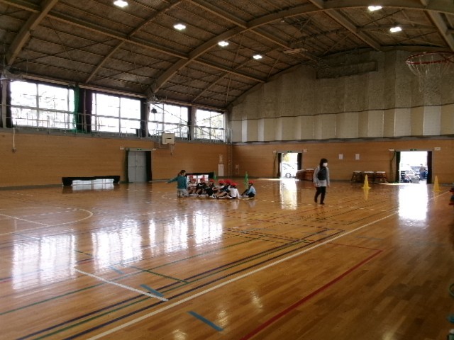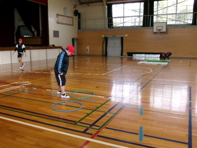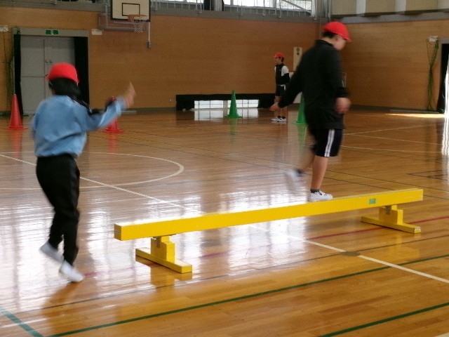 ふれあいの授業の様子です。平均台やフラフープを利用して、いろいろな運きに挑戦しました。
