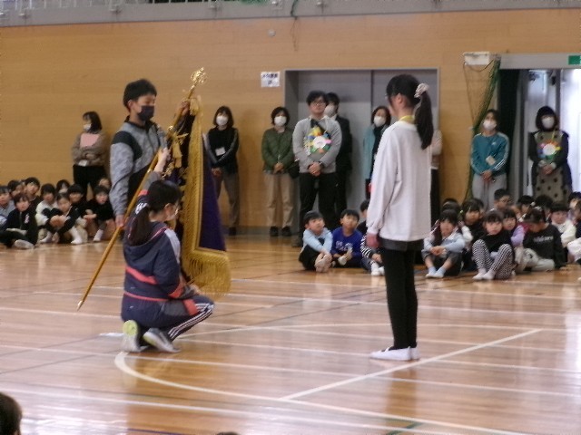 6年生のお礼の出し物の後、校旗の引継ぎを行いました。6年生のさわやかなあいさつや下の学年の人たちに優しくできるすばらしい姿を校旗とともに引き継ぎ、萩小の良さをこれからも守っていきましょう。