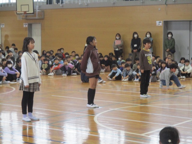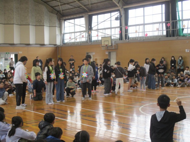 今日は6年生を送る会を行いました。4年生の出し物は、6年生を送り出す気持ちを込めて、クイズやゲーム対決をしました。全力で戦って、6年生のすごさに改めて気づきました。また、学年の呼びかけでは、今まで練習を重ね、大きな声で6年生に今までの感謝の気持ちを伝えることができました。ぜひご家庭で対決の様子など、送る会の思い出を聞いてみてください。