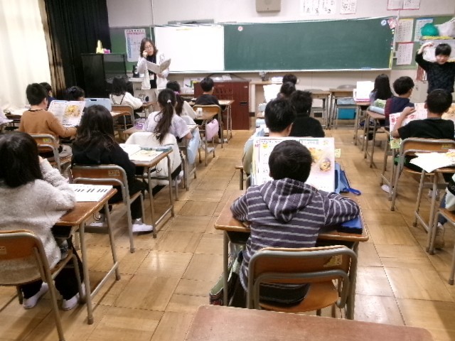 音楽、国語、書写の授業です。1枚目の音楽では、2年生で学習した歌を振り返り、楽しく歌いました。