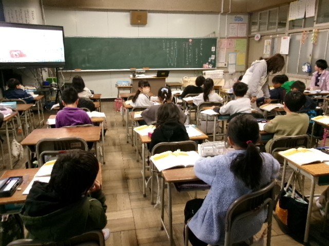国語、体育、算数の授業です。3枚目の算数では、「元の大きさの半分の半分の大きさ」の表し方を確かめました。