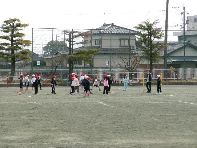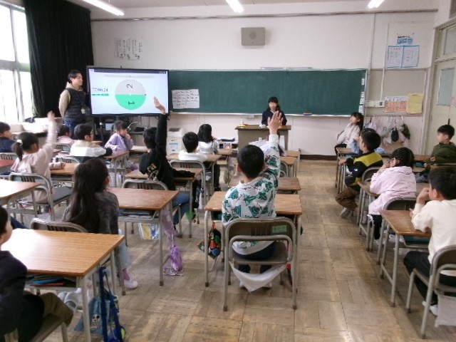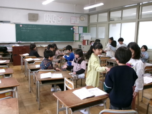 音楽、学活、体育の授業です。1枚目の音楽では、わらべうたの「おちゃらか」などを楽しみました。