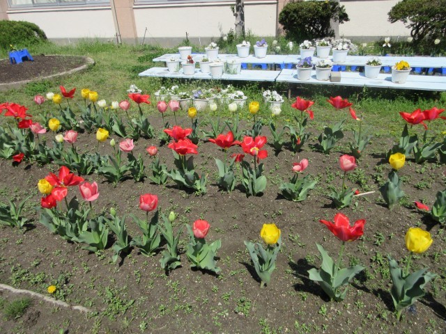 1年生が植えたチューリップがきれいに花を咲かせています。見ているだけで春を感じ、気持ちも明るくなります。始業式でみんなに会えるのを楽しみにしています。