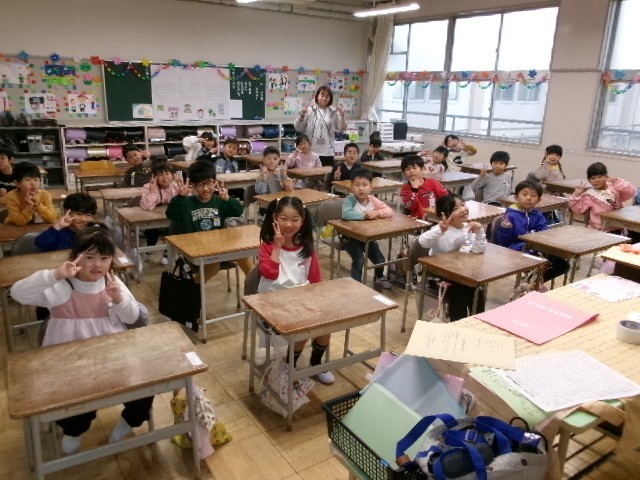 ランドセルから荷物を片付けたところでハイチーズ。