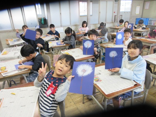 タンポポのわた毛 2年生 4月16日 公開日 2026/04/16 更新日 2026/04/16 2年生 図工でたんぽぽの綿毛を描いています。クレヨンを使って綿の感じを表しました。うまく描けていますね。