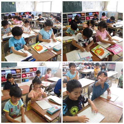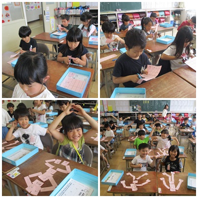 図工の時間に、人の体を作ってみました。腕や脚はどうやって動くのかな。自分の体と見比べながら、作りました。算数では、隣の友だちと「7になあれ」ゲームをしました。さいころを振って出た数が、いくつといくつで7になるか考えながら取り組みました。