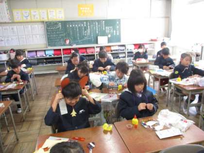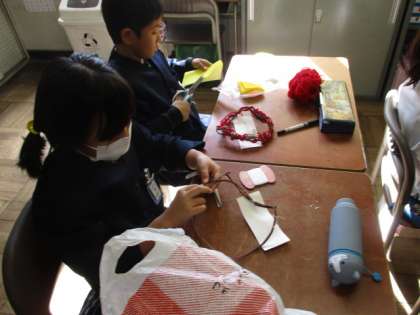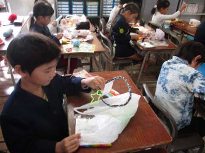 生活科の授業では、サツマイモのつるを使って工作をしました。リースやお面など、それぞれが作りたいものを楽しく作ることができました。