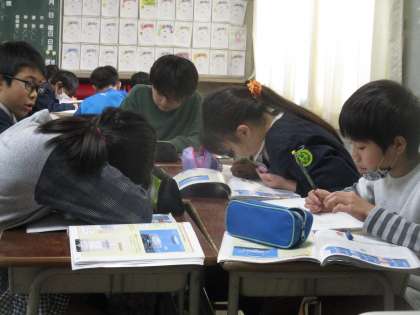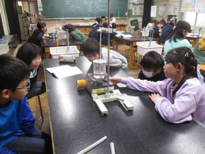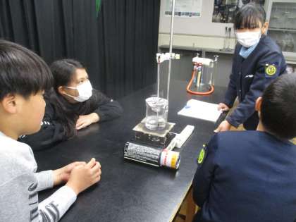 理科の時間には、水を熱していくと、水の温度や様子はどう変わっていくか実験をして調べました。1分ごとに観察をし、すがたをかえていく水の様子を知ることができました。その後、実験から考えたことを班で話し合いました。