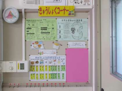 「給食コーナー」ができました。給食当番の人は、コンテナ室から教室に運び、付けわけ、配膳までをみんなで協力して頑張りましょう。献立表には、毎日美味しいメニューがいっぱいです。5月はどんな献立かな。楽しみにしていてください。