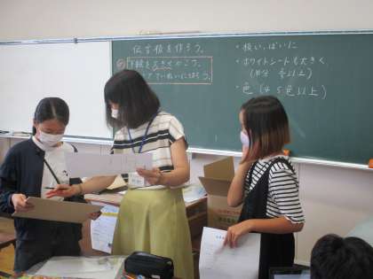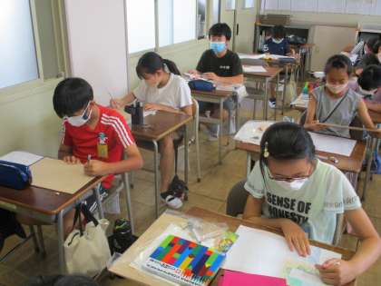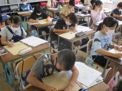図工では、伝言板を作っています。今日は、板に下書きを写してかきました。次は、下書きにそって板を切ります。